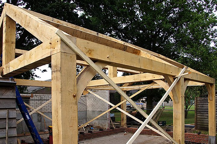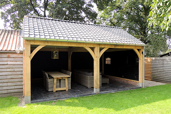 | Vrijstaande houtenoverkapping voorzien van betonnen fundering, stenenborstwering, potdeksel buitenbekleding en pannendak. Het gehele bintwerk is van eiken en uitgevoerd met traditionele pen-gat verbindingen. |
